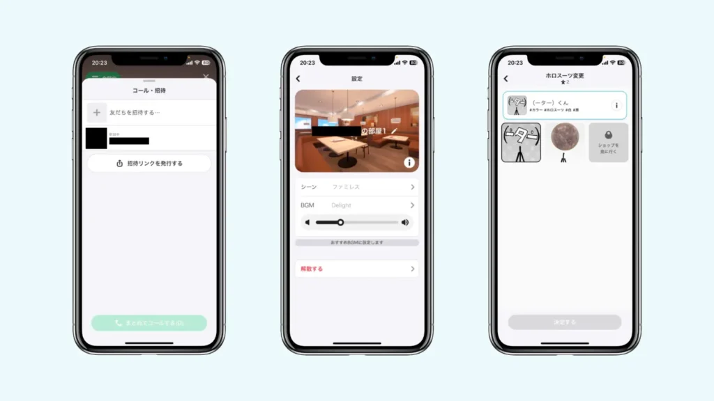 画像(上)の右側の画面は、ハンバーガーメニューをタップすると現れる。この画面でホロスーツの変更やシーンの変更、メンバー管理などが可能だ。