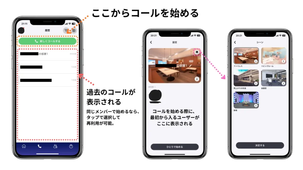 ボトムメニューの電話アイコンをクリックすると、一転さながら電話アプリのような画面が現れる。「新しくコールする」との緑のボタンが上部にあり、そこから通話に参加する人(フレンドから)を選び、通話における各種設定を行って通話を開始できる。