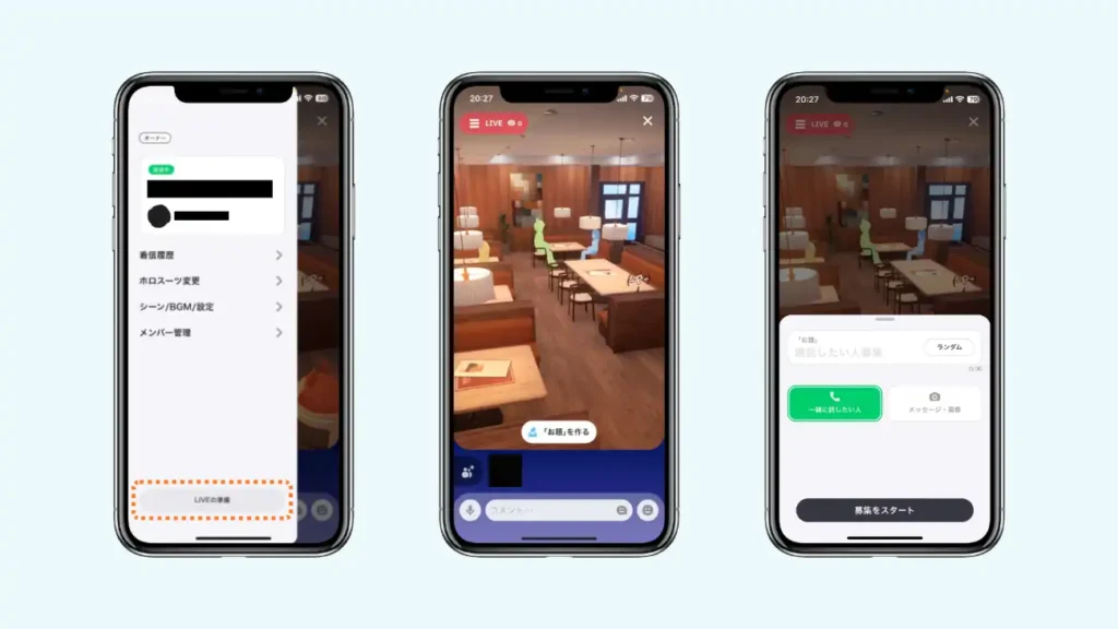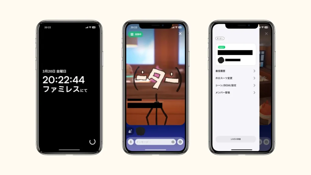 ハンバーガーメニューを開くと下側に、薄灰色の「LIVEの準備」と書かれたボタンからはLIVEを行うことができる。LIVEを開始すると、不特定多数の人がコールを見れる状態となる。